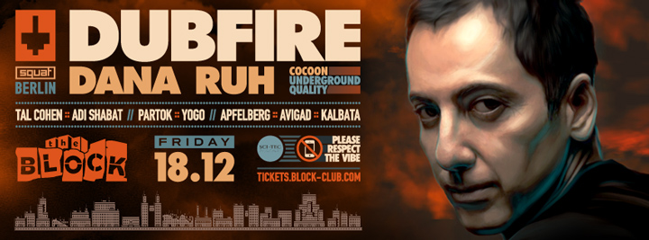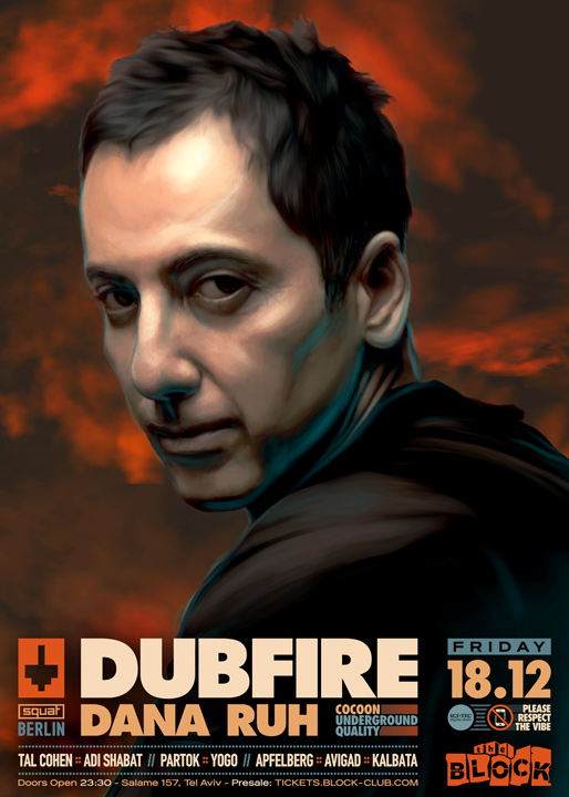 Description | Promotional artwork for an electronic music event in Tel Aviv (Israel). Guest DJs: DUBFIRE (SCI + TEC :: Washington DC) DANA RUH (Cocoon, Ostgut Ton :: Berlin) The Block: Tal Cohen - Adi Shabat The Squat: Partok - Yogo The Lounge: Apfelberg - Avigad - Kalbata |