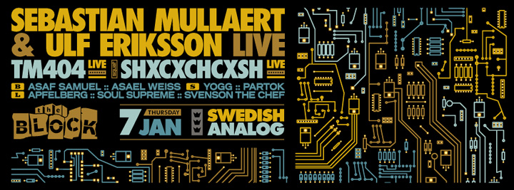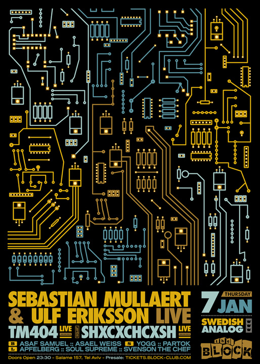 Description | Promotional artwork for an electronic music event in Tel Aviv (Israel). Guest Artists: SEBASTIAN MULLAERT LIVE (Wa Wu We :: Stockholm) ULF ERIKSSON LIVE (Kontra-Musik :: Malmö) TM 404 aka ANDREAS TILLIANDER LIVE (Kontra-Musik :: Stockholm) SHXCXCHCXSH LIVE (Avian :: Norrköping) The Block: Asaf Samuel - Asael Weiss The Squat: Yogg - Partok The Lounge: Apfelberg - Soul Supreme - Svenson The Chef |