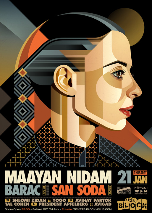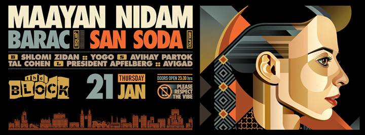 Description | Promotional artwork for an electronic music event in Tel Aviv (Israel). Guest DJs: MAAYAN NIDAM (Perlon :: Berlin) BARAC (Moment Records :: Bucharest) SAN SODA (We Play House :: Berlin) The Block: Shlomi Zidan - Yogo The Squat: Partok - Tal Cohen The Lounge: President Apfelberg - Avigad |
