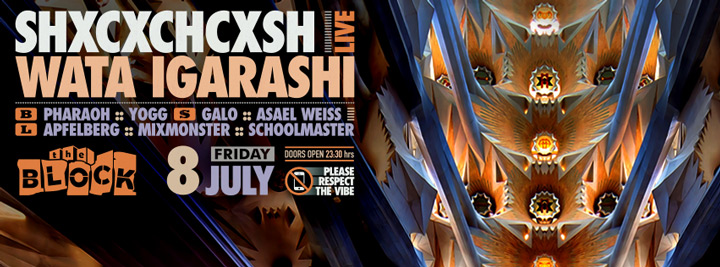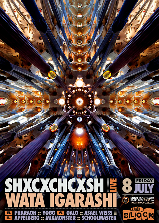 Description | Promotional artwork for an electronic music event in Tel Aviv (Israel). Guest Artists: SHXCXCHCXSH LIVE (Avian :: Norrköping, Berlin) WATA IGARASHI (Midgar :: Shibuya, Tokyo) The Block: Pharaoh - Yogg The Squat: Galo - Asael Weiss The Lounge: Apfelberg - Mixmonster - Schoolmaster |