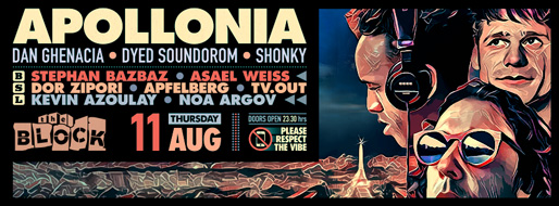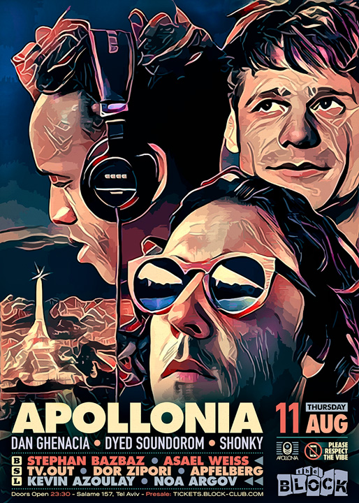 Description | Promotional artwork for an electronic music event in Tel Aviv (Israel). The Block invites APOLLONIA Guest Artists: DAN GHENACIA (Apollonia :: Paris) DYED SOUNDOROM (Apollonia :: Paris) SHONKY (Apollonia :: Berlin) The Block: Stephan Bazbaz - Asael Weiss The Squat: TV.OUT - Dor Zipori - Apfelberg The Lounge: Kevin Azoulay - Noa Argov |