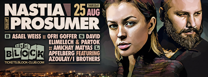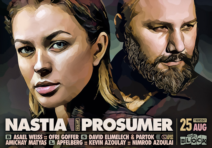 Description | Promotional artwork for an electronic music event in Tel Aviv (Israel). Guest Artists: NASTIA (Propaganda Records :: Kiev) PROSUMER (Potion, Ostgut Ton, Playhouse :: Edinburgh) The Block: Asael Weiss - Ofri Goffer The Squat: David Elimelech - Partok - Amichay Matyas The Lounge: Apfelberg - Kevin Azoulay - Nimrod Azoulai |