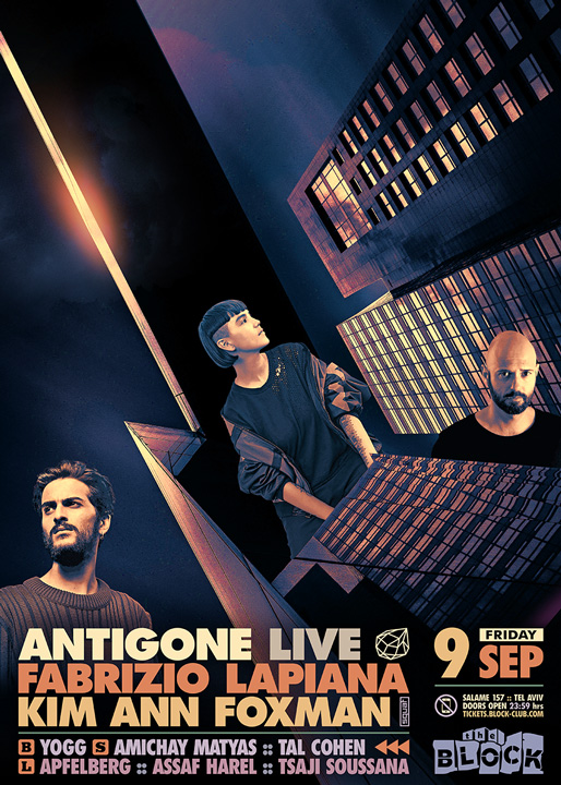 Description | Promotional artwork for an electronic music event in Tel Aviv (Israel). Guest Artists: ANTIGONE LIVE (Concrete, Token :: Paris) FABRIZIO LAPIANA (Attic Music :: Rome) KIM ANN FOXMAN (Firehouse :: Brooklyn) The Block: Yogg The Squat: Amichay Matyas - Tal Cohen The Lounge: Apfelberg - Assaf Harel - Tsaji Soussana |