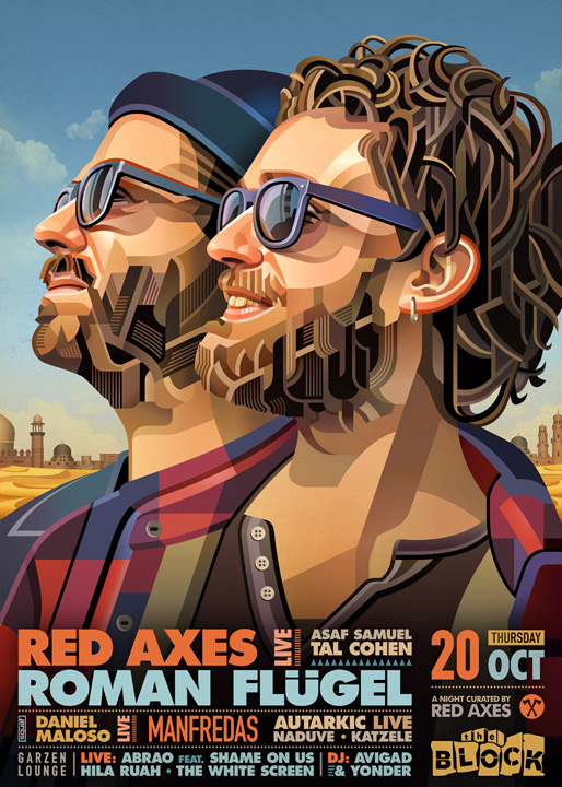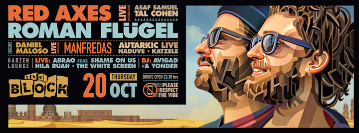 Description | Promotional artwork for an electronic music event in Tel Aviv (Israel). Guest Artists: RED AXES (Garzen Records :: Tel Aviv) ROMAN FLÜGEL (Dial :: Frankfurt) MANFREDAS (Les Disques De La Mort :: Vilnius) DANIEL MALOSO LIVE (Cómeme :: Monterrey) The Block: Asaf Samuel - Tal Cohen The Squat: Autarkic LIVE, Naduve, Katzele The Lounge: Abrão feat. Shame On Us LIVE - Hila Ruach LIVE - Avigad - Yonder |