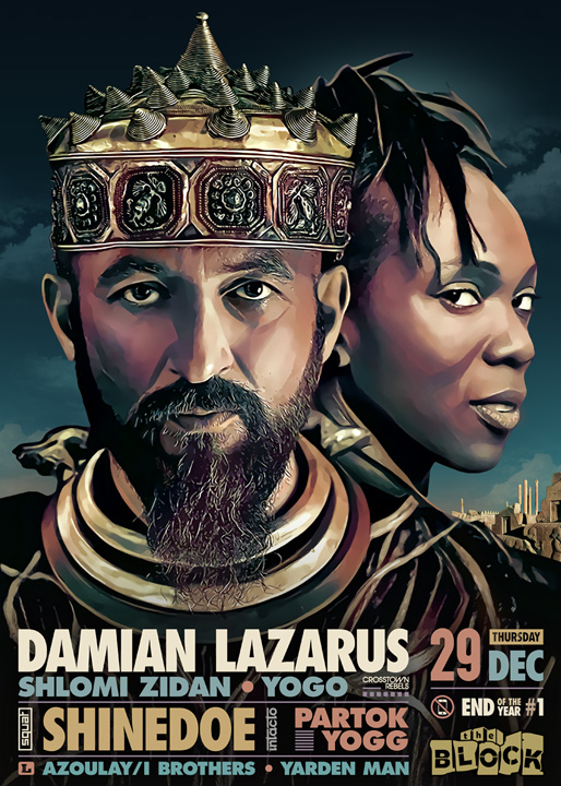 Description | Promotional artwork for an electronic music event in Tel Aviv (Israel). Guest Artists: DAMIAN LAZARUS (Crosstown Rebels :: Outer Space) SHINEDOE (Intacto Records :: Amsterdam) The Block: Shlomi Zidan - Yogo The Squat: Partok - Yogg The Lounge: Azoulay/i Brothers - Yarden Man |