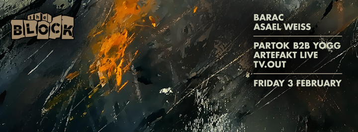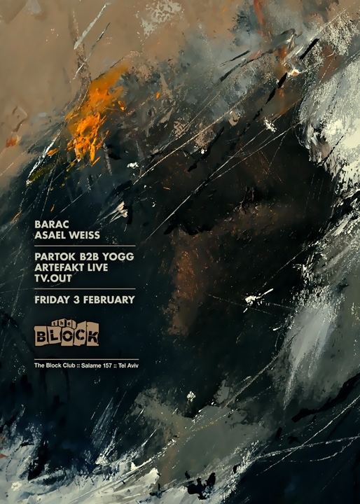 Description | Promotional artwork for an electronic music event in Tel Aviv (Israel). Guest Artists: BARAC (Moment Records :: Bucharest) ARTEFAKT LIVE (Field, Prologue, Delsin :: Berlin) The Block: Asael Weiss The Squat: Partok b2b Yogg - TV.OUT |