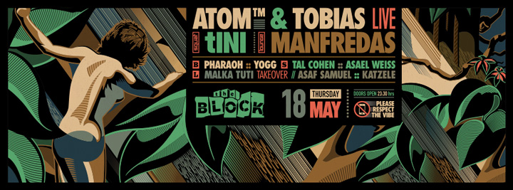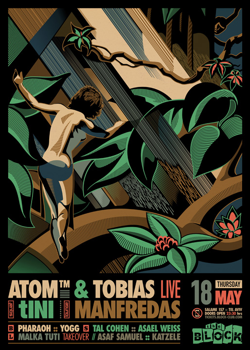 Description | Promotional artwork for an electronic music event in Tel Aviv (Israel). Guest Artists: ATOM™ & TOBIAS (Ostgut Ton :: Berlin) TINI (tINI and the gang - Berlin, Ibiza) MANFREDAS (Multi Culti :: Vilnius) The Block: Partok - Yogg The Squat: Tal Cohen - Asael Weiss The Lounge: Asaf Samuel - Katzele Artwork: Remake of Paul Landacre - Rima (1933, Wood engraving) |