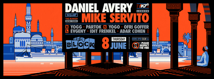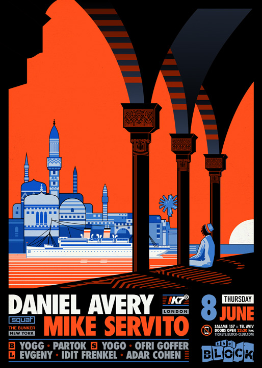Description | Promotional artwork for an electronic music event in Tel Aviv (Israel). Guest Artists: DANIEL AVERY (!K7, Phantasy :: London) MIKE SERVITO (The Bunker :: Brooklyn) The Block: Yogg - Partok The Squat: Yogo - Ofri Goffer The Lounge: Evgeny - Idit Frenkel - Adar Cohen Artwork: Remake of the "Hamburg-Amerika Line" travel poster for "HAPAG - Mittelmeer und Orientfahrten (1929)" by Ottomar Anton. |