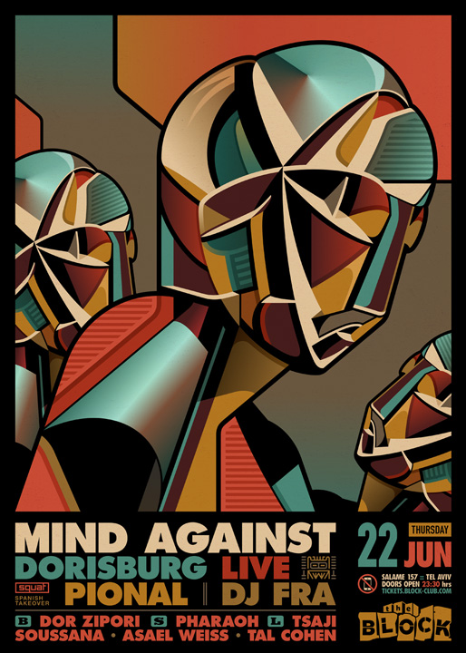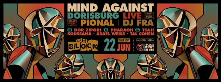 Description | Promotional artwork for an electronic music event in Tel Aviv (Israel). Guest Artists: MIND AGAINST (Life and Death :: Milan, Berlin) DORISBURG LIVE (Hivern Discs, Aniara :: Gothenburg) PIONAL (Hivern Discs, Nitsa :: Barcelona) DJ FRA (Hivern Discs, Aniara :: Gothenburg) The Block: Dor Zipori The Squat: Pharaoh The Lounge: Tsaji Soussana - Asael Weiss - Tal Cohen |