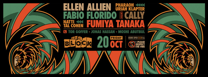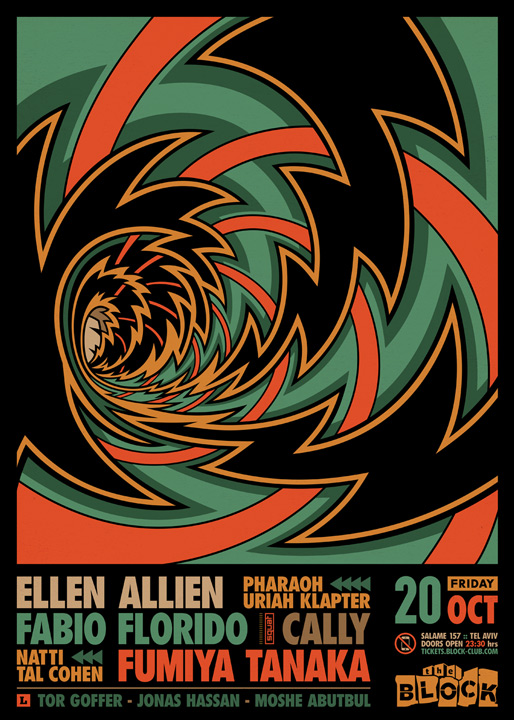 Description | Promotional artwork for an electronic music event in Tel Aviv (Israel). Guest Artists: ELLEN ALLIEN (B-Pitch Control :: Berlin) FUMIYA TANAKA (Perlon, Torema :: Tokyo) FABIO FLORIDO (M-nus, Rukus :: Berlin) CALLY (More Than Music :: Bucharest) The Block: Pharaoh - Uriah Klapter The Squat: Natti - Tal Cohen The Lounge: Tor Goffer - Jonas Hassan - Moshe Abutbul Artwork: Remake of Cyril Power - The Vortex (1929) |