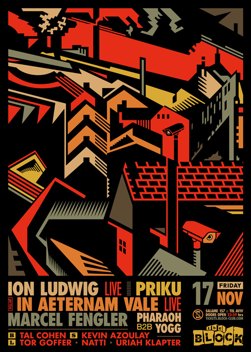 Description | Promotional artwork for an electronic music event in Tel Aviv (Israel). Guest Artists: ION LUDWIG LIVE (Ugold Series :: Berlin) PRIKU (Atipic :: Bucharest) MARCEL FENGLER (IMF, Mote Evolver :: Berlin) IN AETERNAM VALE LIVE (Minimal Wave :: Lyon) The Block: Tal Cohen The Squat: Kevin Azoulay The Lounge: Tor Goffer - Natti - Uriah Klapter Artwork: Remake of Edward Wadsworth - A Black Country Village (1920) |