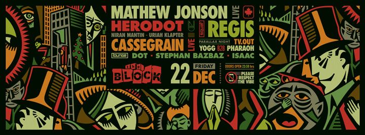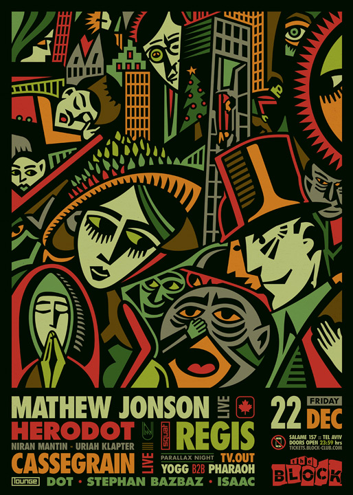 Description | Promotional artwork for an electronic music event in Tel Aviv (Israel). Guest Artists: MATHEW JONSON LIVE (Wagon Repair :: Berlin) REGIS (Downwards :: Birmingham) HERODOT (Unanim Records :: Bucharest) CASSEGRAIN LIVE (Arcing Seas :: Berlin) The Block: Niran Mantin - Uriah Klapter The Squat: Yogg b2b Pharaoh - TV.OUT The Lounge: Dot - Stephan Bazbaz - Isaac Artwork: Remake of Frans Masereel - Faces (1921) |