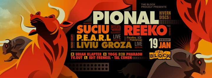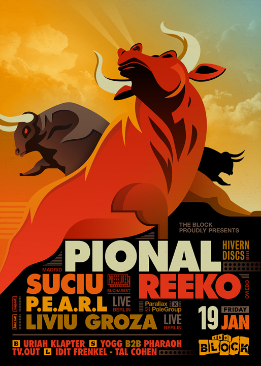 Description | Promotional artwork for an electronic music event in Tel Aviv (Israel). Guest Artists: PIONAL (Hivern Discs :: Barcelona) REEKO (PoleGroup :: Barcelona) SUCIU (Pressure Traxx :: Bucharest) P.E.A.R.L (PoleGroup :: Berlin) LIVIU GROZA LIVE (Berlin) The Block: Uriah Klapter The Squat: Yogg b2b Pharaoh - TV.OUT The Lounge: Idit Frenkel - Tal Cohen |