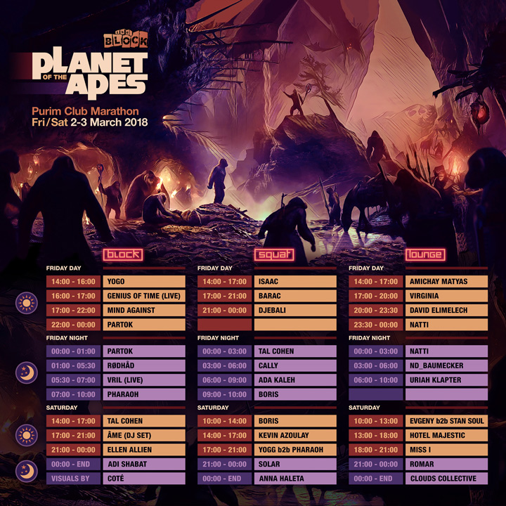 Description | Promotional artwork for an electronic music event in Tel Aviv (Israel). Guest Artists: ÂME DJ (Berlin, GER) MIND AGAINST (Milan, ITA) RØDHÅD (Berlin, GER) ELLEN ALLIEN (Berlin, GER) VRIL LIVE (Berlin, GER) GENIUS OF TIME LIVE (Gothenburg, SWE) BARAC (Bucharest, ROM) BORIS (Berlin, GER) ND_BAUMECKER (Berlin, GER) VIRGINIA (Berlin, GER) DJEBALI (Paris, FRA) ADA KALEH (Bucharest, ROM) CALLY (Bucharest, ROM) ROMAR (Zurich, SWI) MISS I (Bucharest, ROM) SOLAR (San Francisco, USA) Partok - Tal Cohen - Yogg - Pharaoh - Anna Haleta Clouds Collective - Hotel Majestic - Kevin Azoulay Uriah Klapter - Adi Shabat - Natti - David Elimelech Amichay Matyas - Yogo - Evgeny - Stan Soul - Isaac Visuals by COTÉ (Bucharest, ROM) |