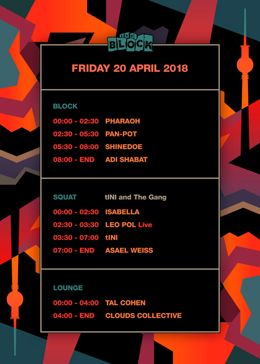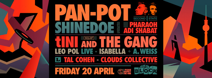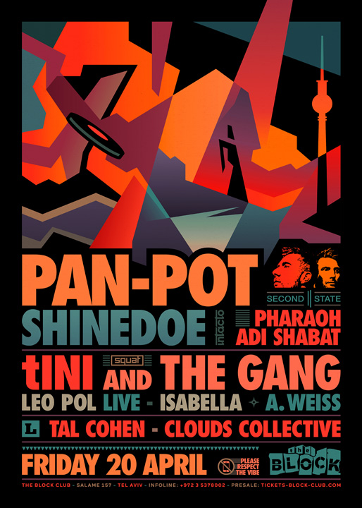 Description | Promotional artwork for an electronic music event in Tel Aviv (Israel). Guest Artists: PAN-POT (Second State :: Berlin) TINI & THE GANG (Rolls 'N' Do :: Berlin) SHINEDOE (Intacto :: Amsterdam) The Block: Pharaoh - Adi Shabat The Squat: Leo Pol LIVE - Isabella - Asael Weiss The Lounge: Tal Cohen - Clouds Collective |