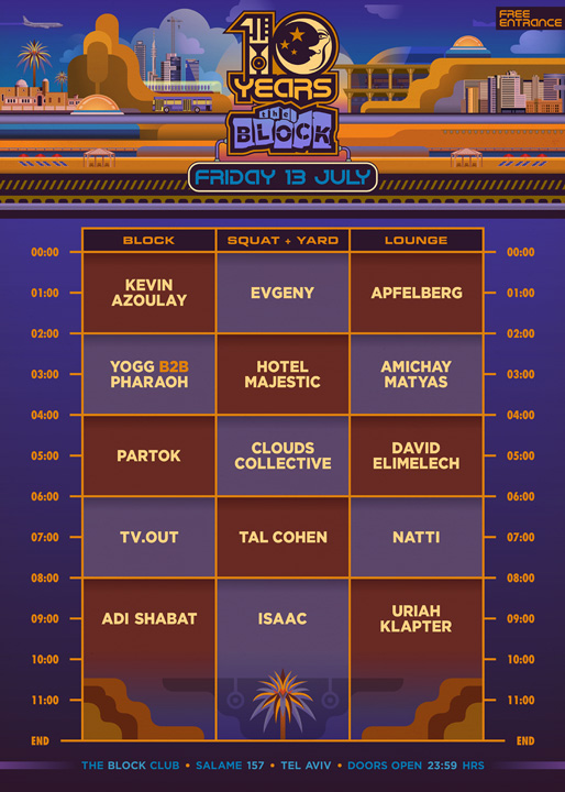 Description | Promotional artwork for an electronic music event in Tel Aviv (Israel). 🔴 BLOCK KEVIN AZOULAY (The Block :: Tel Aviv) YOGG b2b PHARAOH (The Block, Parallax :: Tel Aviv) PARTOK (The Block :: Berlin) TV.OUT (Alphabet, Pag, Parallax :: Tel Aviv) ADI SHABAT (The Block, Rabbits In The Sand :: Tel Aviv) 🔴 YARD + SQUAT EVGENY (Roof Animals :: Tel Aviv) HOTEL MAJESTIC (Tel Aviv) CLOUDS COLLECTIVE (The Block :: Tel Aviv) TAL COHEN (The Block :: Tel Aviv) ISAAC (Tel Aviv) 🔴 LOUNGE PRESIDENT APFELBERG (The Block :: Tel Aviv) AMICHAY MATYAS (Bauhaus, The Block :: Tel Aviv) DAVID ELIMELECH (Tel Aviv) NATTI (Tel Aviv) URIAH KLAPTER (News :: Tel Aviv) |