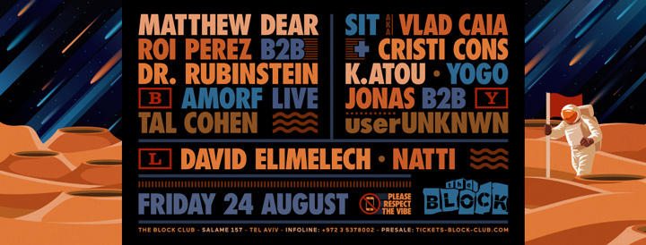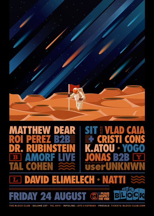 Description | Promotional artwork for an electronic music event in Tel Aviv (Israel). Guest Artists: MATTHEW DEAR (Ghostly International :: New York) ROI PEREZ (Ostgut Ton :: Berlin) DR. RUBINSTEIN (Berlin) K.ATOU (Revolt! :: Athens) SIT DJ (Amphia :: Bucharest) AMORF LIVE (Amphia :: Bucharest) The Block: Yogo The Squat: Tal Cohen - Jonas Hassan - userUNKNWN The Lounge: David Elimelech - Natti |