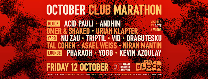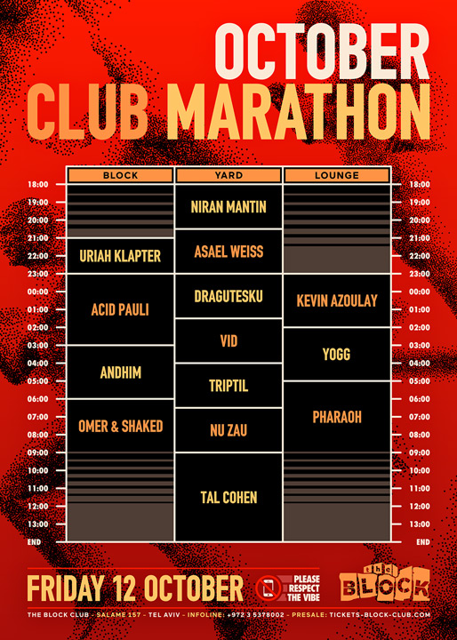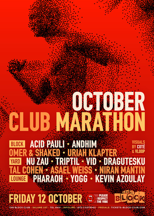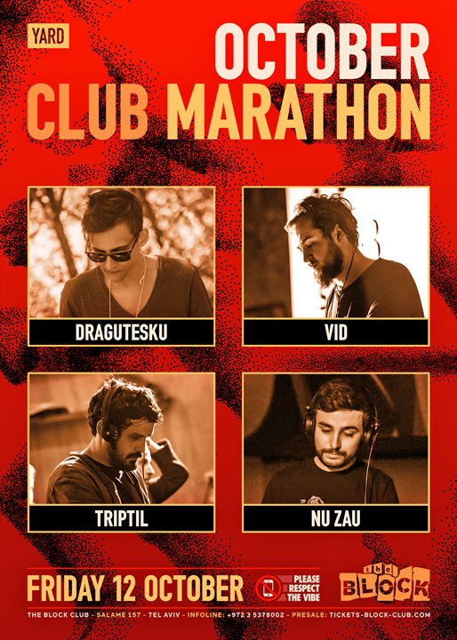 Description | Promotional artwork for an electronic music event in Tel Aviv (Israel). Guest Artists: ACID PAULI (Ouïe :: Berlin) ANDHIM (Superfriends :: Berlin) NU ZAU (UVAR :: Bucharest) TRIPTIL (Feno Volana :: Bucharest) VID (Andromeda :: Bucharest) DRAGUTESKU (Tupiar Records :: Bucharest) The Block: Omer & Shaked - Uriah Klapter The Squat: Tal Cohen - Asael Weiss - Niran Mantin The Lounge: Pharaoh - Yogg - Kevin Azoulay |