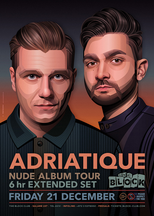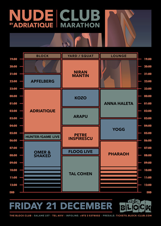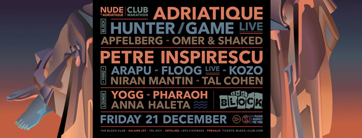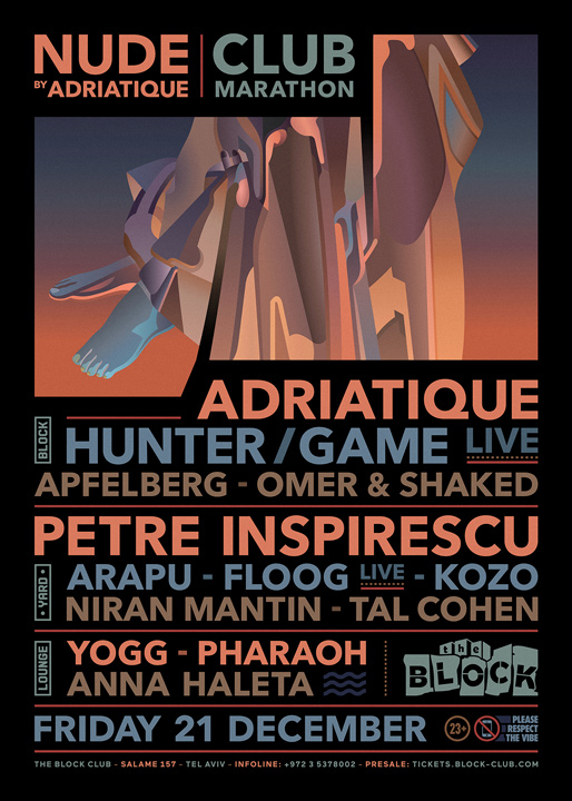 Description | Promotional artwork for an electronic music event in Tel Aviv (Israel). Guest Artists: ADRIATIQUE 6 Hr SET (Diynamic :: Zurich) HUNTER/GAME LIVE (Kompakt, Just This :: Milan) PETRE INSPIRESCU ([a:rpia:r] :: Bucharest) ARAPU (Pressure Traxx :: Bucharest) FLOOG LIVE (Mulen :: Bucharest) KOZO ([a:rpia:r], Understand :: Bucharest) The Block: Apfelberg - Omer & Shaked The Squat: Niran Mantin - Tal Cohen The Lounge: Yogg - Pharaoh - Anna Haleta |