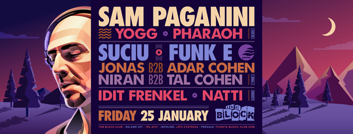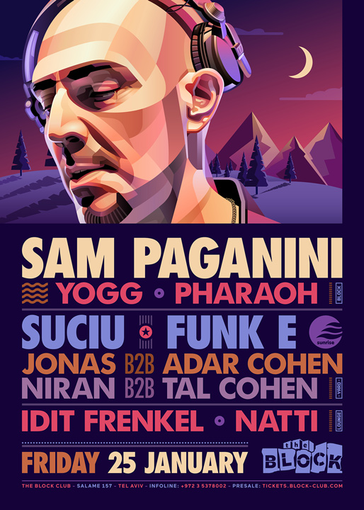 Description | Promotional artwork for an electronic music event in Tel Aviv (Israel). Guest Artists: SAM PAGANINI (JAM, Drumcode :: Treviso) SUCIU (Pressure Traxx :: Bucharest) FUNK E (Pleasure Zone :: Bucharest) The Block: Yogg - Pharaoh The Squat: Clouds Collective - Tal Cohen The Lounge: Idit Frenkel - Natti |