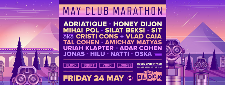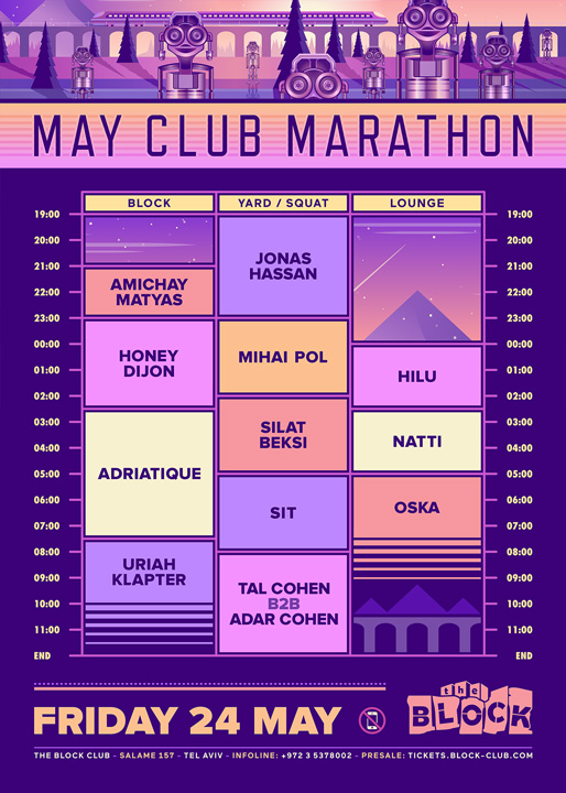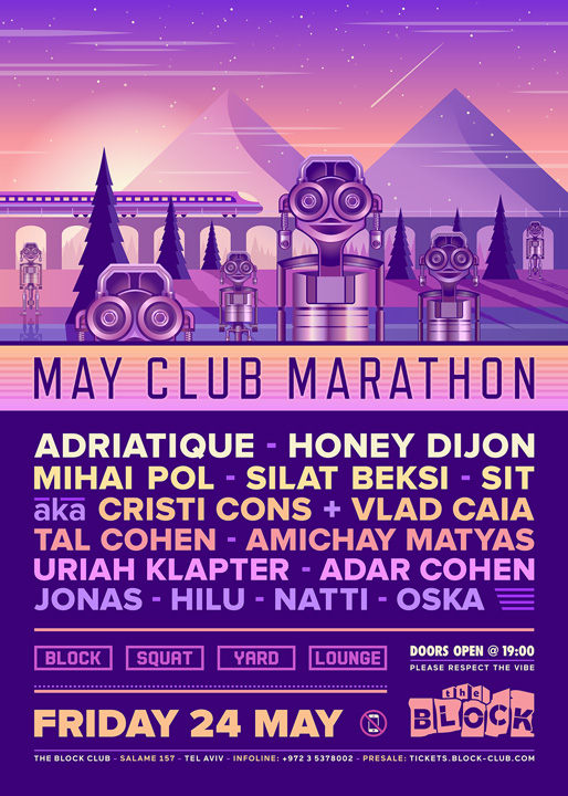Description | Promotional artwork for an electronic music event in Tel Aviv (Israel). Guest Artists: ADRIATIQUE (Diynamic :: Zurich) HONEY DIJON (Classic :: Chicago, NYC) MIHAI POL (Moment Records :: Bucharest) SILAT BEKSI (Modeight Records :: Kiev) SIT (Amphia :: Bucharest) The Block: Amichay Matyas - Uriah Klapter The Yard: Jonas Hassan - Tal Cohen - Adar Cohen The Lounge: Hilu - Natti - Oska |