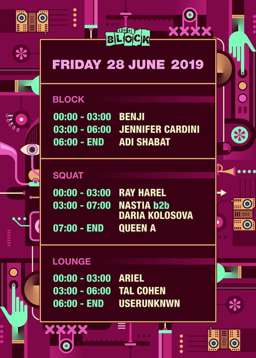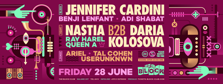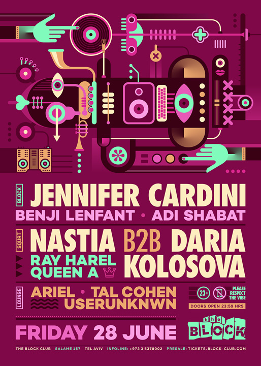 Description | Promotional artwork for an electronic music event in Tel Aviv (Israel). Guest Artists: JENNIFER CARDINI (Correspondant :: Berlin) NASTIA (Propaganda Records :: Kiev) DARIA KOLOSOVA (Materia :: Kiev) The Block: Benji - Adi Shabat The Yard: Ray Harel - Queen A The Lounge: Ariel - Tal Cohen - Userunknwn |