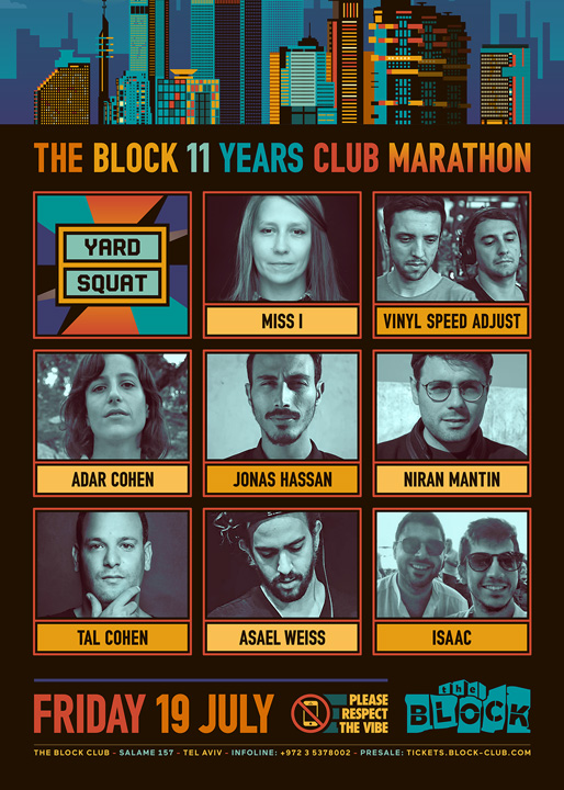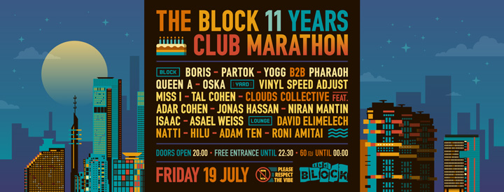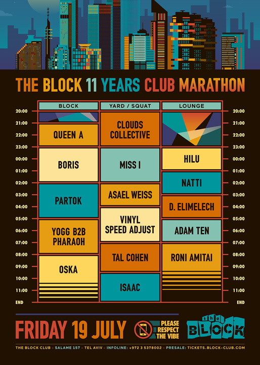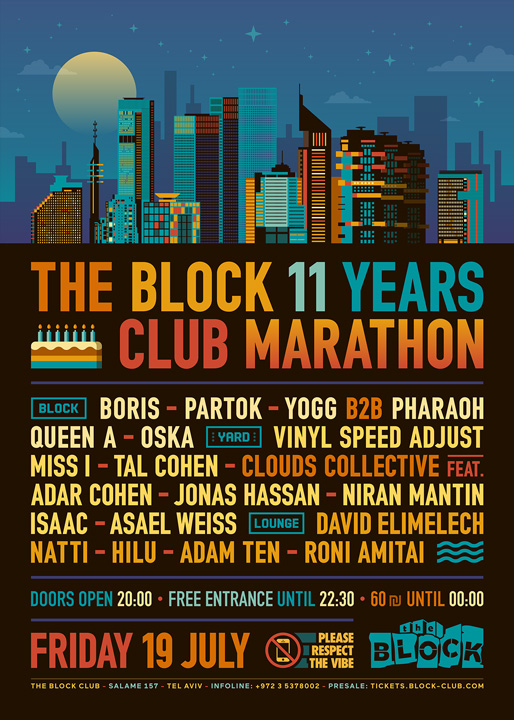 Description | Promotional artwork for an electronic music event in Tel Aviv (Israel). Guest Artists: BORIS (Ostgut Ton :: Berlin) PARTOK (The Block :: Berlin) VINYL SPEED ADJUST (VSA :: Bucharest) MISS I (Misbits :: Bucharest) The Block: Yogg - Pharaoh - Oska - Queen A The Yard: Tal Cohen - Clouds Collective - Isaac The Lounge: Hilu - Natti - D. Elimelech - Adam Ten - Natti |