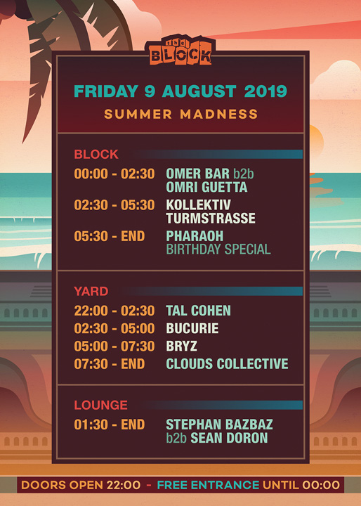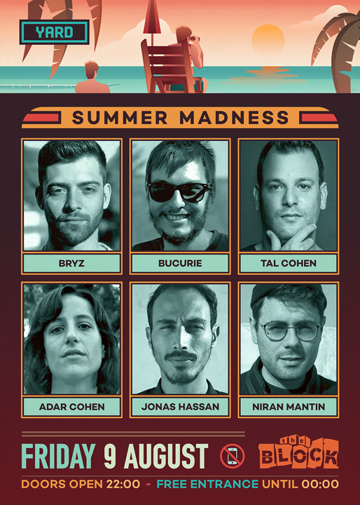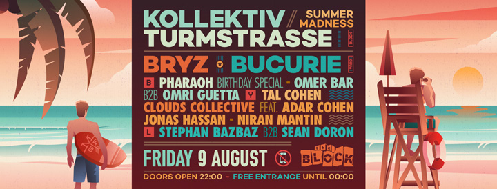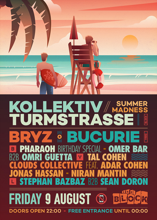 Description | Promotional artwork for an electronic music event in Tel Aviv (Israel). Guest Artists: KOLLEKTIV TURMSTRASSE (MGF :: Hamburg) BRYZ (Tzinah Records :: Bucharest) BUCURIE (Otaku Records :: Bucharest) The Block: Omer Bar - Omri Guetta - Pharaoh The Yard: Tal Cohen - Clouds Collective The Lounge: Stephan Bazbaz - Sean Doron |