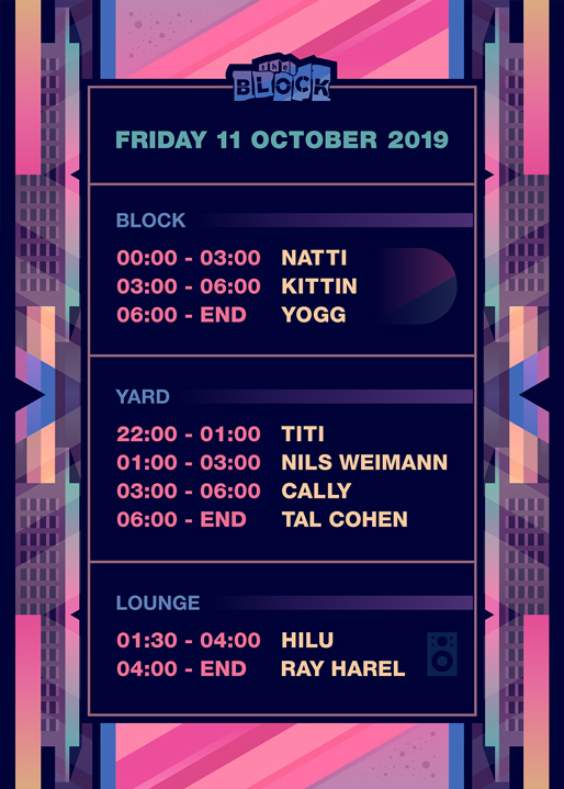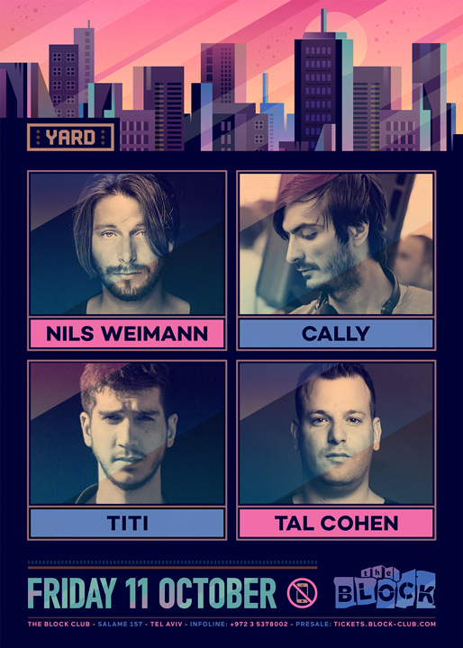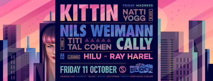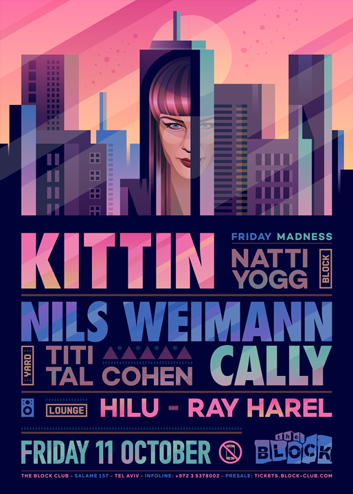 Description | Promotional artwork for an electronic music event in Tel Aviv (Israel). Guest Artists: KITTIN (Nobody's Bizzness :: Paris) NILS WEIMANN (Subtil :: Frankfurt) CALLY (Sunrise :: Bucharest) The Block: Yogg - Natti The Yard: Tal Cohen - Titi The Lounge: Hilu - Ray Harel |