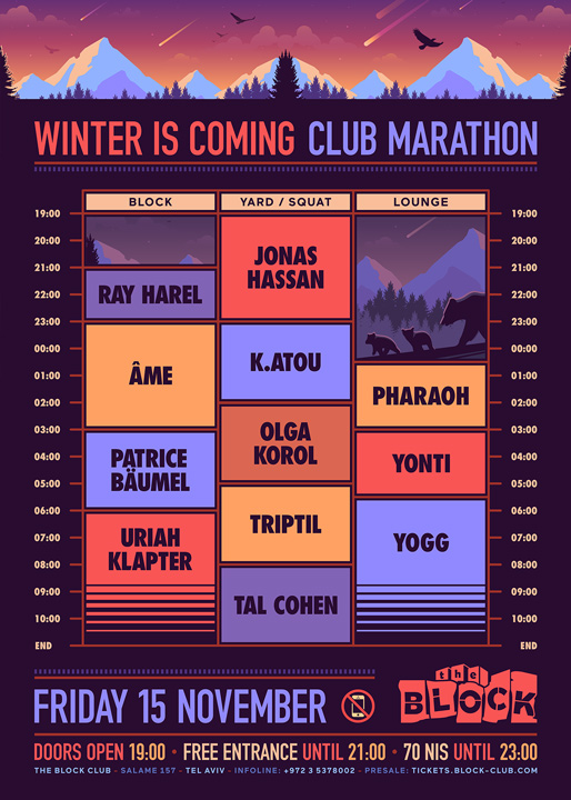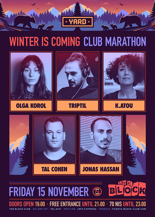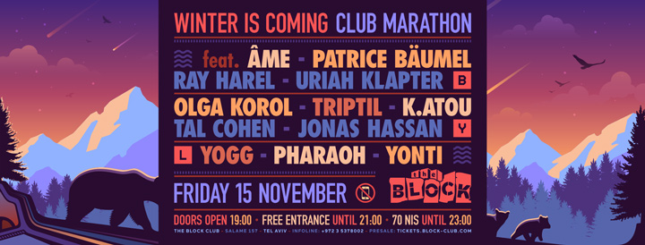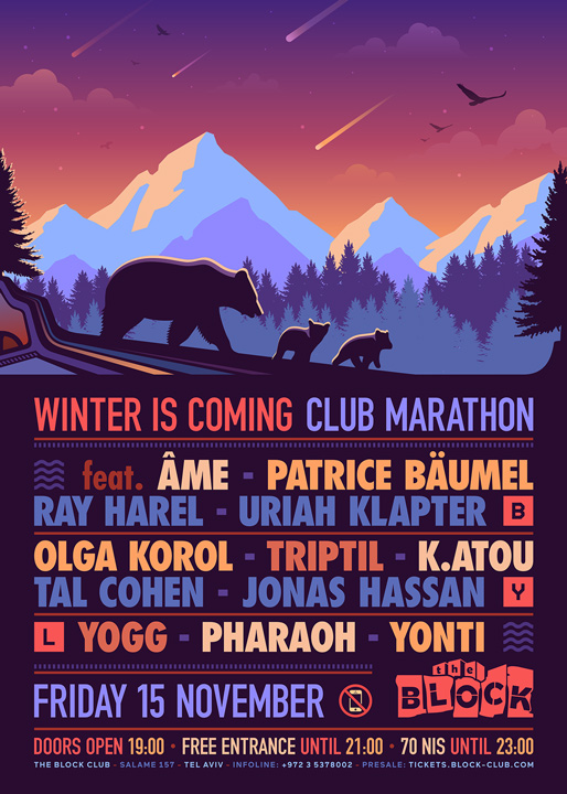 Description | Promotional artwork for an electronic music event in Tel Aviv (Israel). Guest Artists: ÂME DJ (Innervisions :: Berlin) PATRICE BÄUMEL (Kompakt :: Amsterdam) OLGA KOROL (Body Parts :: Berlin) TRIPTIL (Feno Volana :: Bucharest, London) K.ATOU (Revolt! :: Athens) The Block: Ray Harel - Uriah Klapter The Yard: Jonas Hassan - Tal Cohen The Lounge: Pharaoh - Yonti - Yogg |