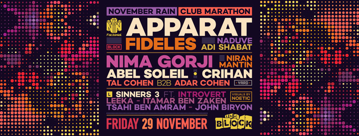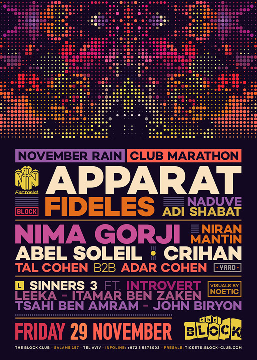 Description | Promotional artwork for an electronic music event in Tel Aviv (Israel). Guest Artists: APPARAT (Mute :: Berlin) FIDELES (Afterlife, Innervisions :: Italy) NIMA GORJI (NG TRAX :: Ibiza) ABEL SOLEIL (Groove :: Bucharest) CRIHAN (Sunrise :: Bucharest) The Block: Naduve - Adi Shabat The Yard: Tal Cohen - Adar Cohen - Niran Mantin The Lounge: Introvert - Leeka - Tsahi Ben Amram Itamar Ben Zaken - John Biryon |