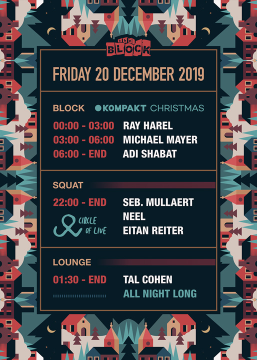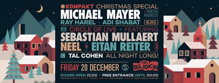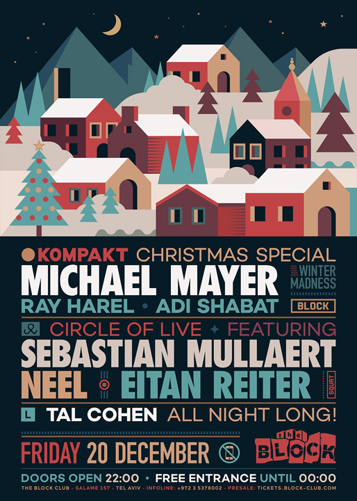 Description | Promotional artwork for an electronic music event in Tel Aviv (Israel). Guest Artists: MICHAEL MAYER (Kompakt :: Cologne) SEBASTIAN MULLAERT LIVE (Wa Wu We :: Stockholm) NEEL LIVE (Spazio Disponibile :: Rome) EITAN REITER LIVE (Aleph Zero :: Tel Aviv) The Block: Ray Harel - Adi Shabat The Lounge: Tal Cohen (all night long) |