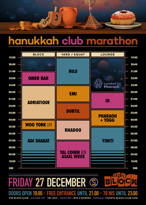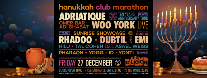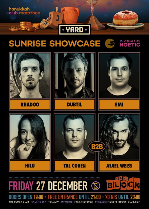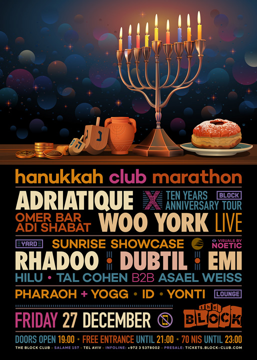 Description | Promotional artwork for an electronic music event in Tel Aviv (Israel). Guest Artists: ADRIATIQUE (Diynamic :: Zurich) WOO YORK LIVE (Afterlife, Dystopian :: Kiev) RHADOO ([a:rpia:r] :: Bucharest) DUBTIL (Amphia, Understand :: Bucharest) EMI (Contur, Sunrise :: Bucharest) The Block: Omer Bar - Adi Shabat The Yard: Hilu - Tal Cohen - Asael Weiss The Lounge: Pharaoh - Yogg - ID - Yonti |