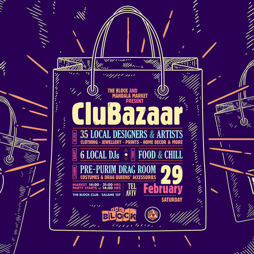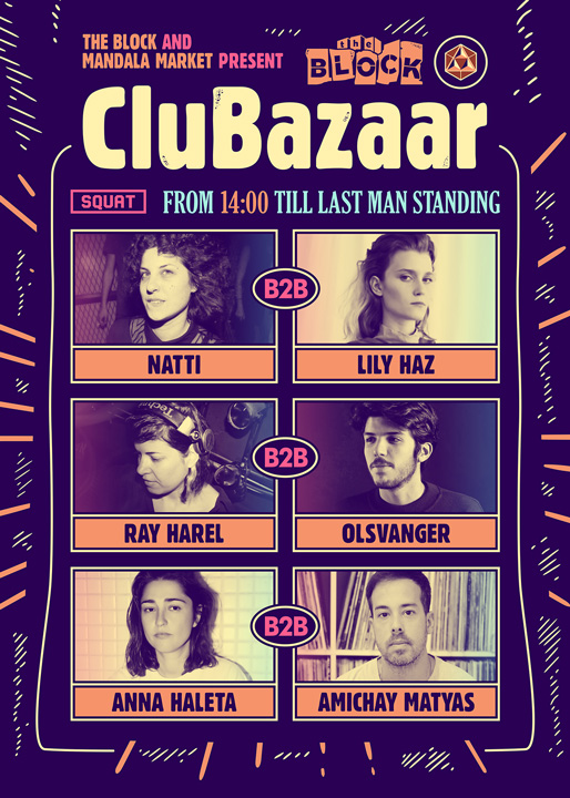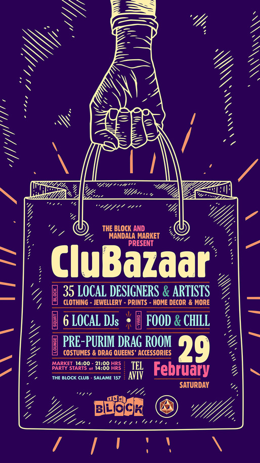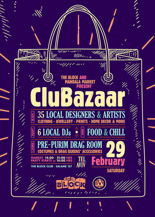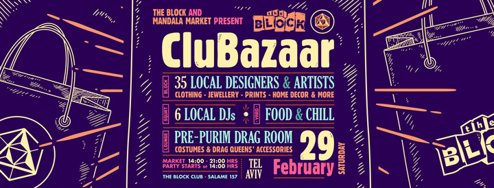 Description | Promotional artwork for an electronic music event in Tel Aviv (Israel). The Block & Mandala Market present: Saturday 29 February at The Wild South, CluBazaar - Local Art, Music and Market Block (from 14:00 to 21:00) - 35 Local Designers & Artists Clothing - Jewellery - Prints - Home decor & more The Squat (from 14:00 till last man standing) - It's Party Time! feat: - NATTI - b2b - LILY HAZ - - RAY HAREL - b2b - OLSVANGÈR - - ANNA HALETA - b2b - AMICHAY MATYAS - The Lounge (from 14:00 to 21:00) - Pre-Purim Drag Room Costumes & Drag Queens' Accesories |