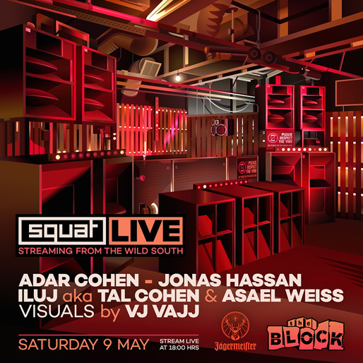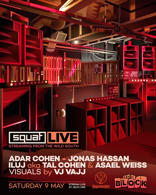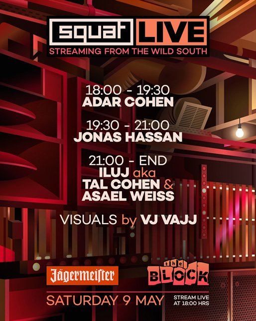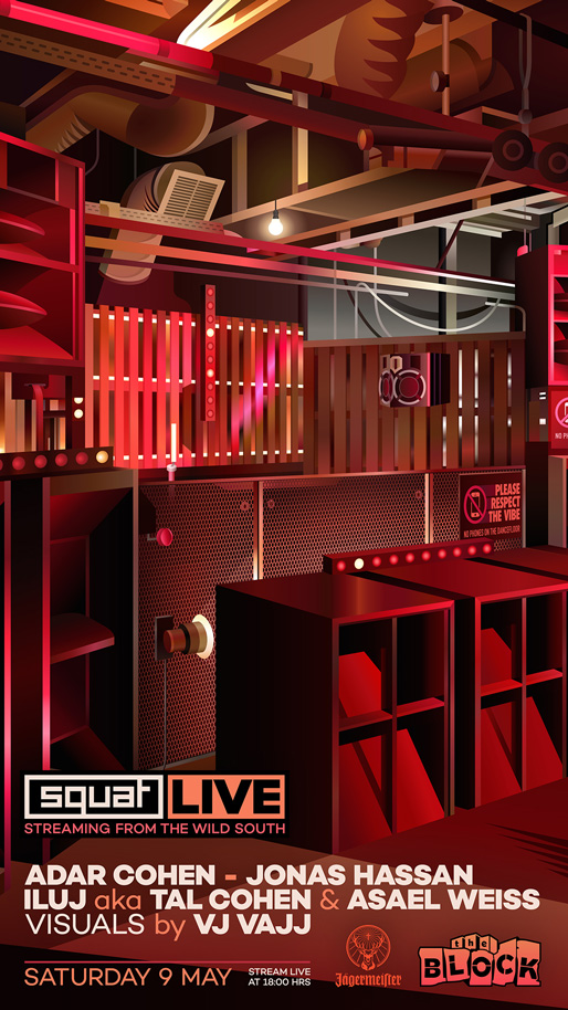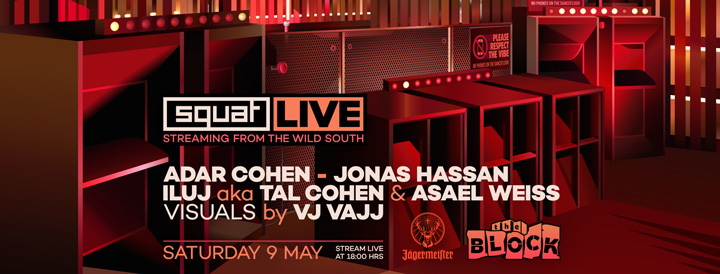 Description | Promotional artwork for an electronic music event in Tel Aviv (Israel). 🔴 Streaming from the wild south: ~ ~ ~ SQUAT LIVE ~ ~ ~ Starting at 18:00 Resident DJs: JONAS HASSAN (The Block, CC :: Tel Aviv) ADAR COHEN (The Block, CC :: Tel Aviv) TAL COHEN (The Block :: Tel Aviv) ASAEL WEISS (The Block :: Tel Aviv) Visuals by VJ VAJJ 🔴 Click HERE to view the broadcast. |