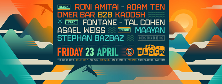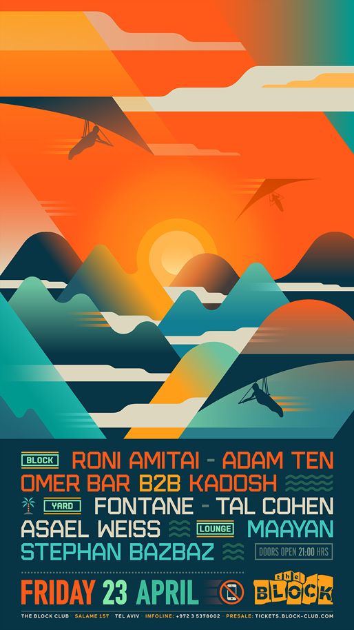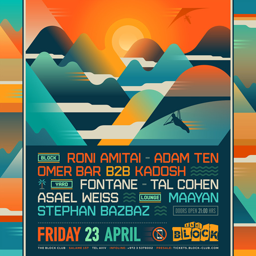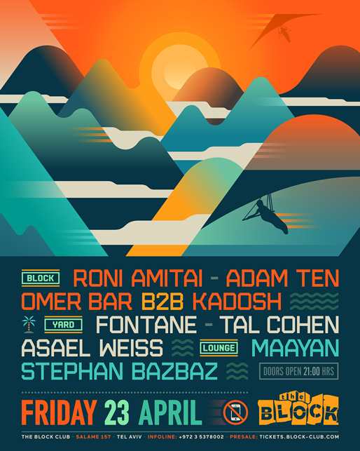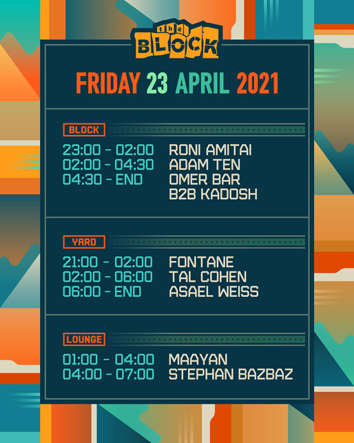 Description | Promotional artwork for an electronic music event in Tel Aviv (Israel). Friday 23 April 2021 Friday at The Block The Block: RONI AMITAI ADAM TEN OMER BAR KADOSH The Yard / Squat: FONTANE TAL COHEN ASAEL WEISS The Lounge: MAAYAN DODO STEPHAN BAZBAZ |