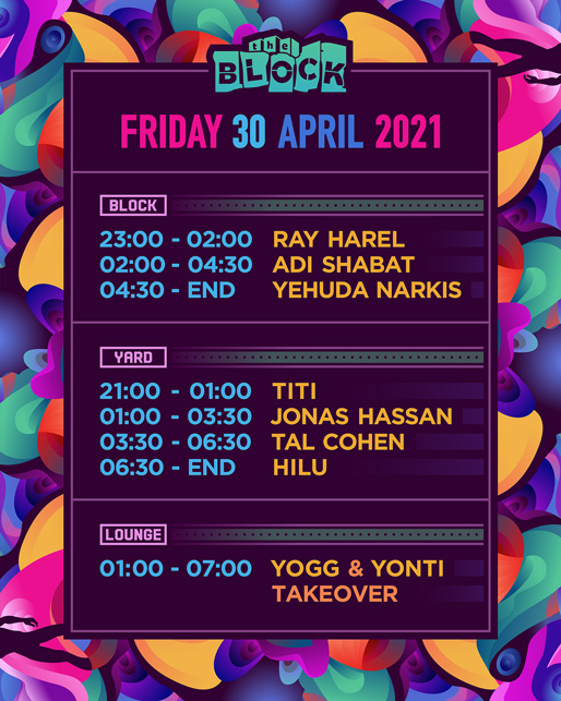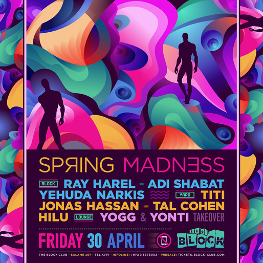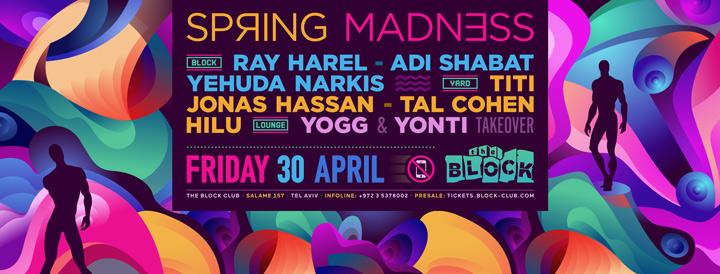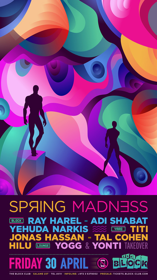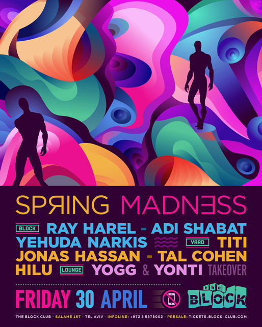 Description | Promotional artwork for an electronic music event in Tel Aviv (Israel). Friday 30 April 2021 Spring Madness The Block: RAY HAREL ADI SHABAT YEHUDA NARKIS The Yard / Squat: TITI JONAS HASSAN TAL COHEN HILU The Lounge: YOGG YONTI |