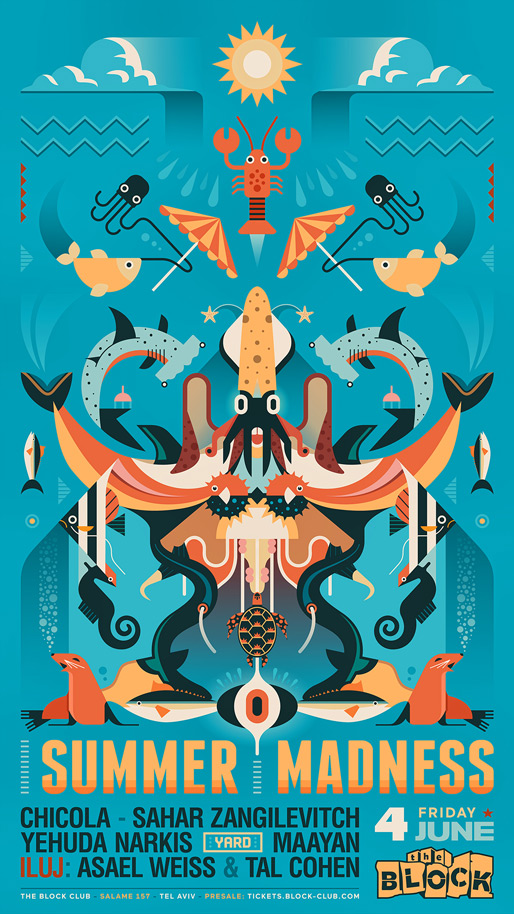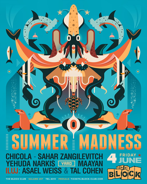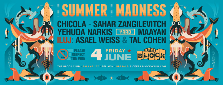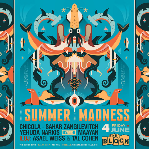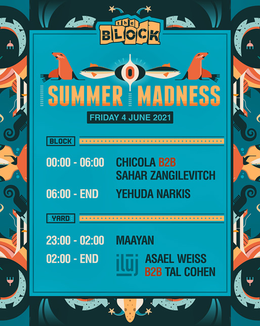 Description | Promotional artwork for an electronic music event in Tel Aviv (Israel). Friday 4 June 2021 Summer Madness The Block: SAHAR ZANGILEVITCH CHICOLA YEHUDA NARKIS The Yard / Squat: MAAYAN TAL COHEN ASAEL WEISS |