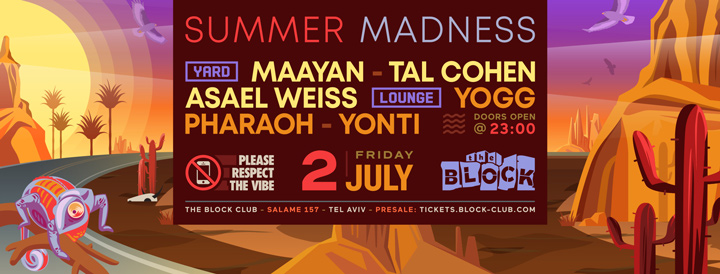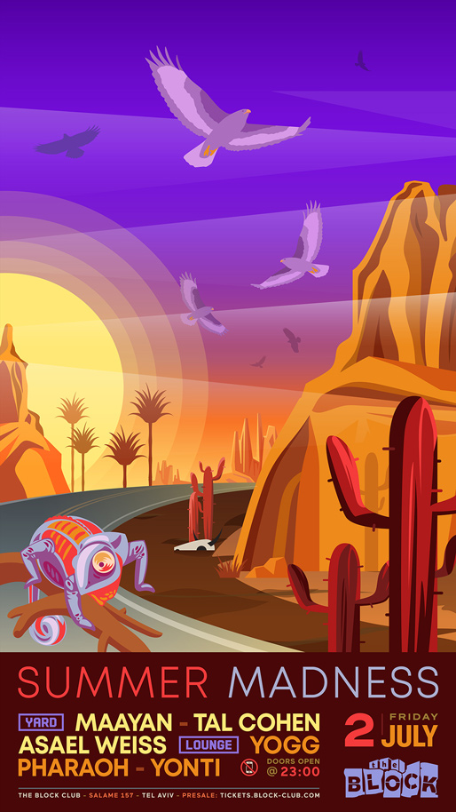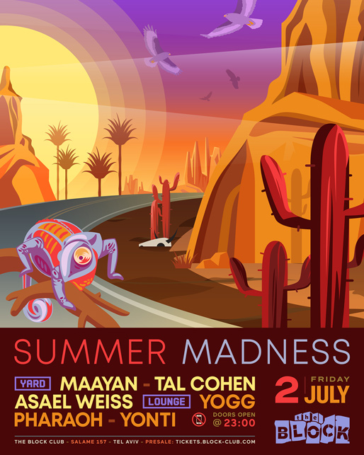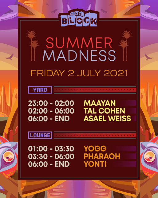 Description | Promotional artwork for an electronic music event in Tel Aviv (Israel). Friday 2 July 2021 Summer Madness The Yard / Squat: MAAYAN DODO TAL COHEN ASAEL WEISS The Lounge: YOGG PHARAOH YONTI |