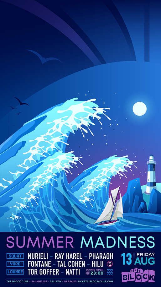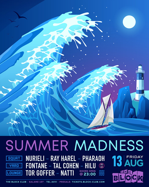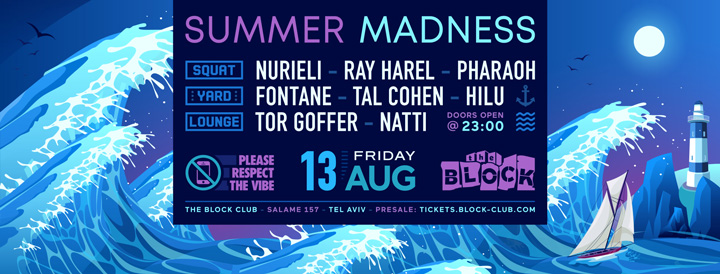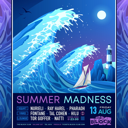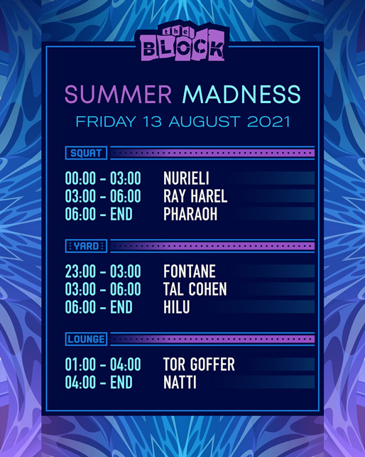 Description | Promotional artwork for an electronic music event in Tel Aviv (Israel). Friday 13 August 2021 Summer Madness The Squat: NURIELI RAY HAREL PHARAOH The Yard: FONTANE TAL COHEN HILU The Lounge: TOR GOFFER NATTI |