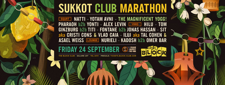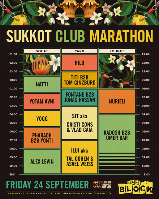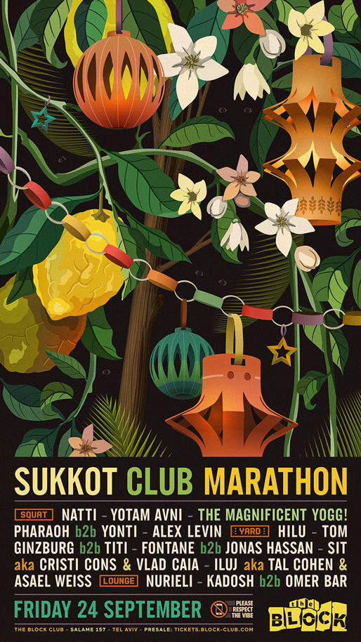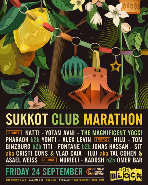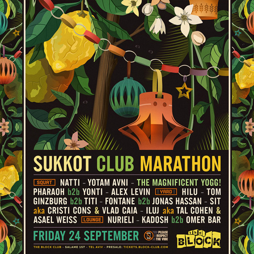 Description | Promotional artwork for an electronic music event in Tel Aviv (Israel). Friday 24 September 2021 Sukkot Club Marathon The Squat: NATTI YOTAM AVNI YOGG PHARAOH YONTI ALEX LEVIN The Yard: HILU TITI TOM GINZBURG FONTANE JONAS HASSAN CRISTI CONS (Bucharest) VLAD CAIA (Bucharest) TAL COHEN ASAEL WEISS The Lounge: NURIELI OMER BAR KADOSH |