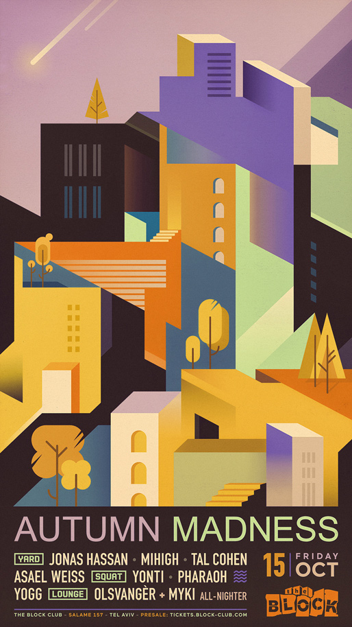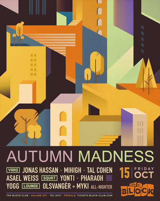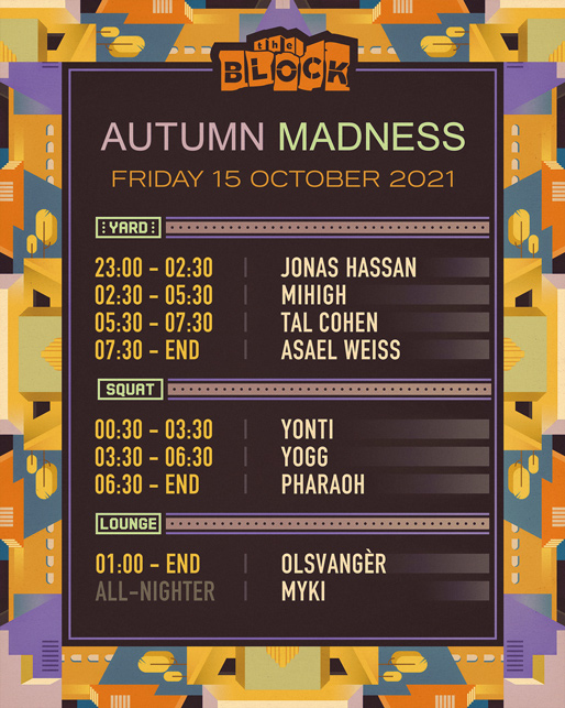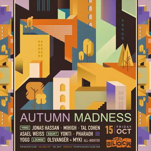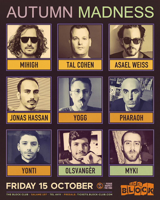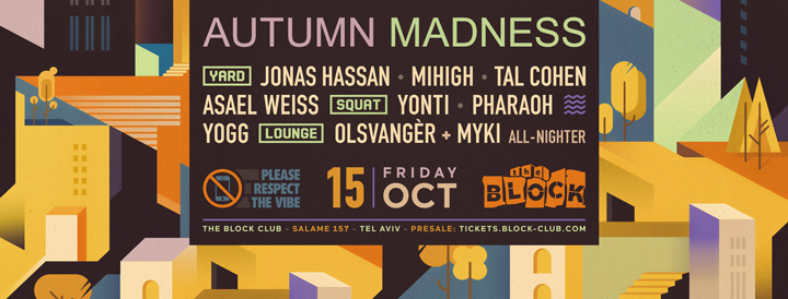 Description | Promotional artwork for an electronic music event in Tel Aviv (Israel). Friday 15 October 2021 Autumn Madness The Squat: YONTI YOGG PHARAOH The Yard: JONAS HASSAN MIHIGH (Cluj-Napoca) TAL COHEN ASAEL WEISS The Lounge: OLSVANGÈR MYKI |