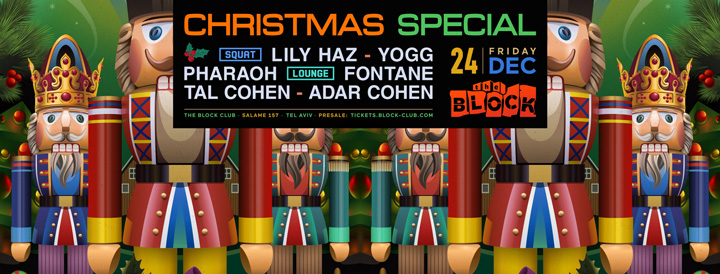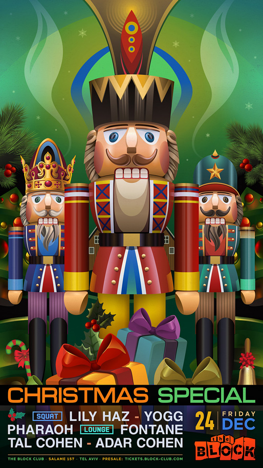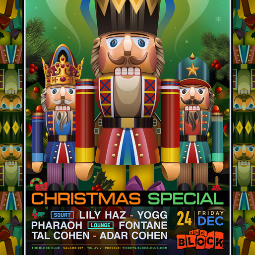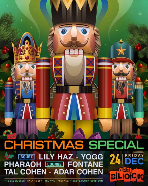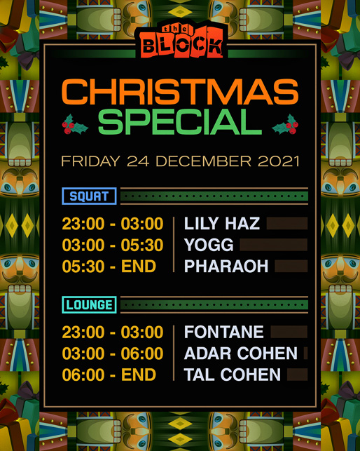 Description | Promotional artwork for an electronic music event in Tel Aviv (Israel). Friday 24 December 2021 Christmas Special The Squat: LILY HAZ YOGG PHARAOH The Lounge: FONTANE TAL COHEN ADAR COHEN The Yard: Relaxation, Discussion & Dance area |