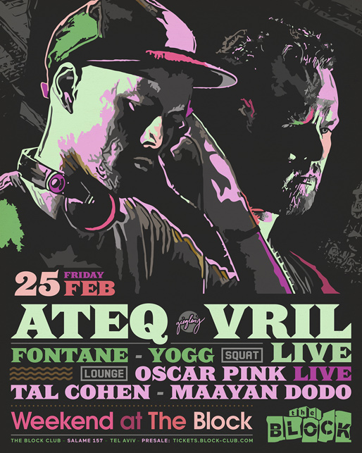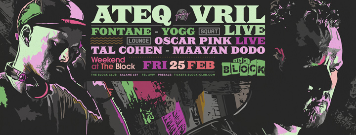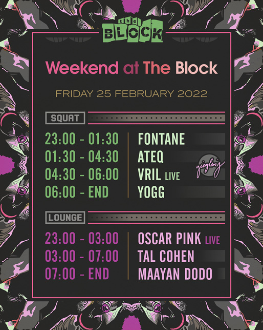 Description | Promotional artwork for an electronic music event in Tel Aviv (Israel). Friday 25 February 2022 Weekend Part 2 The Squat: FONTANE ATEQ (Giegling :: Germany) VRIL LIVE (Giegling :: Germany) YOGG The Lounge: OSCAR PINK TAL COHEN MAAYAN DODO |