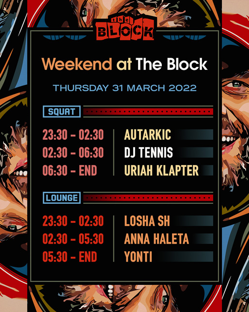Description | Promotional artwork for an electronic music event in Tel Aviv (Israel). Thursday 31 March 2022 Weekend Part 1 The Squat: AUTARKIC DJ TENNIS URIAH KLAPTER The Lounge: LOSHA SH ANNA HALETA YONTI |