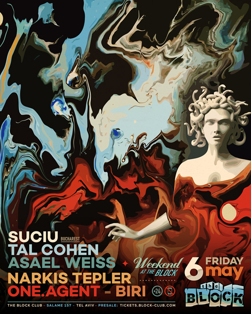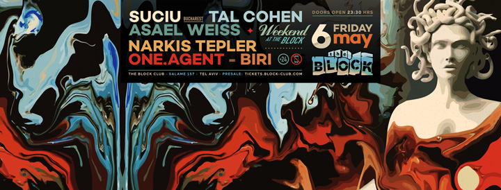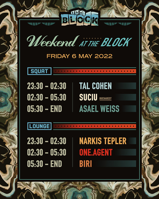 Description | Promotional artwork for an electronic music event in Tel Aviv (Israel). Friday 6 May 2022 Weekend Part 2 The Squat: TAL COHEN SUCIU (Pressure Traxx :: Bucharest) ASAEL WEISS The Lounge: NARKIS TEPLER ONE.AGENT BIRI |