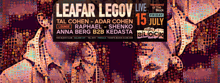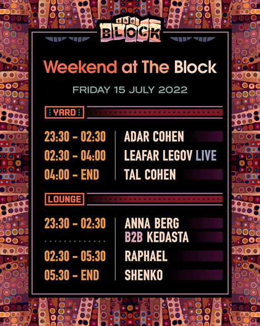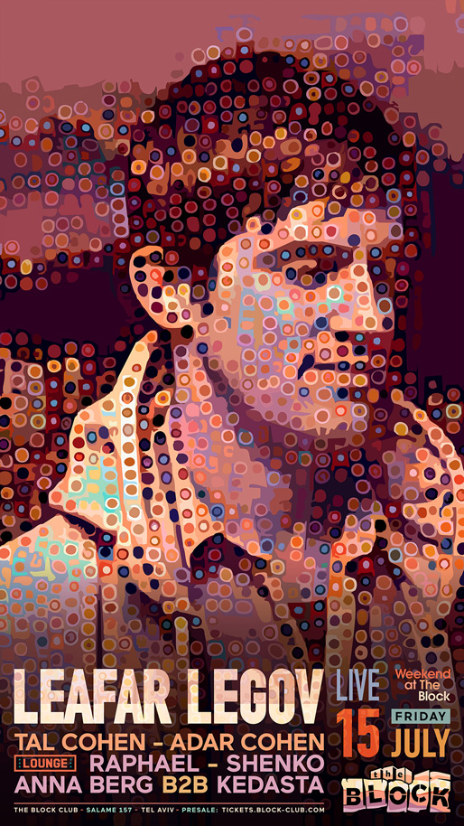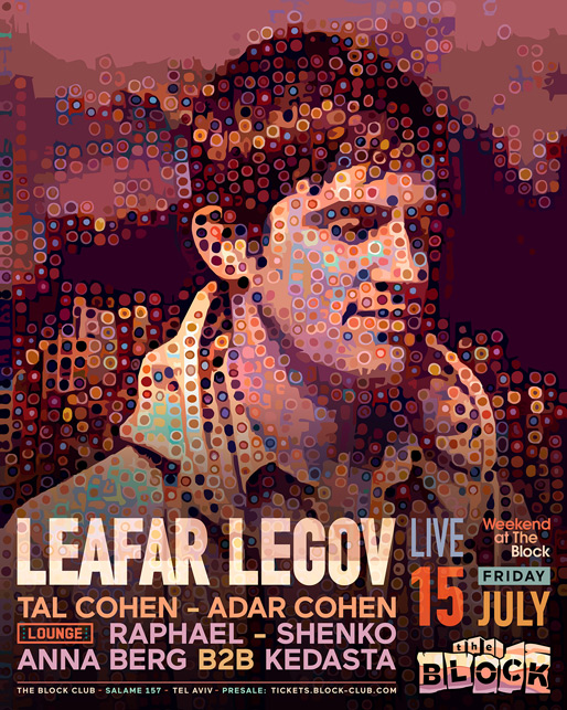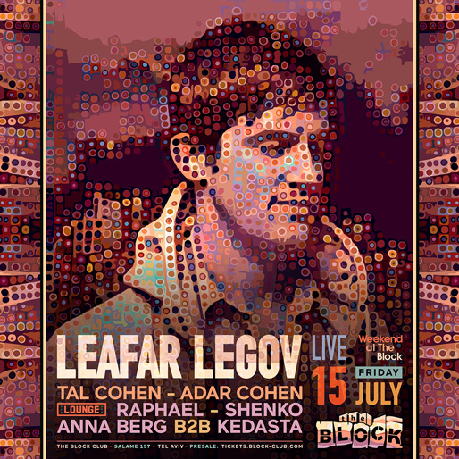 Description | Promotional artwork for an electronic music event in Tel Aviv (Israel). Friday 15 July 2022 Weekend Part 2 The Yard: ADAR COHEN LEAFAR LEGOV LIVE (Giegling :: Germany) TAL COHEN The Lounge: ANNA BERG KEDASTA RAPHAEL SHENKO |