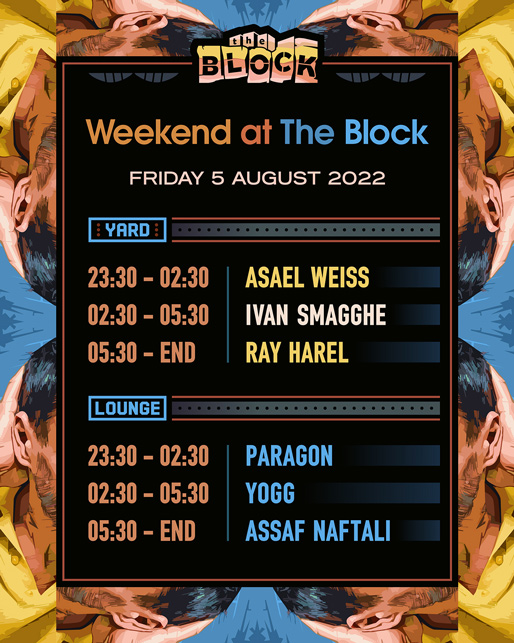 Description | Promotional artwork for an electronic music event in Tel Aviv (Israel). Friday 5 August 2022 Weekend Part 2 The Yard: ASAEL WEISS IVAN SMAGGHE RAY HAREL The Lounge: PARAGON YOGG ASSAF NAFTALI |