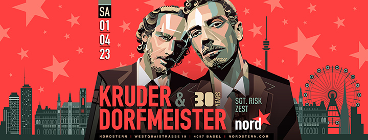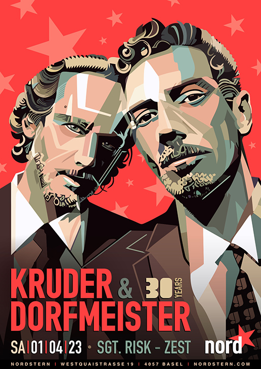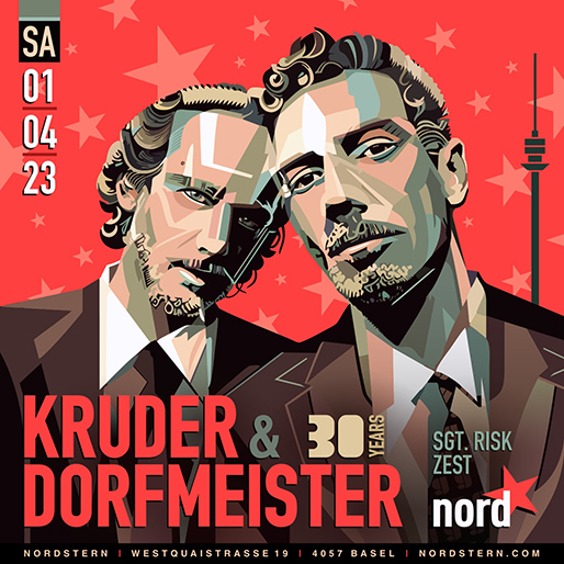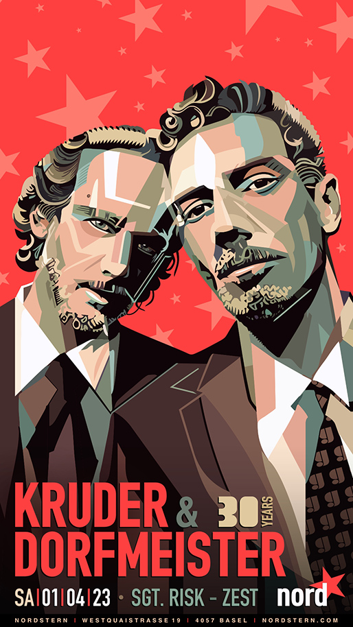 Description | Promotional artwork for an electronic music event in Basel (Switzerland). 30 Years KRUDER & DORFMEISTER Samstag, 1 April 2023 PETER KRUDER RICHARD DORFMEISTER Support by Sgt.Risk, Zest |