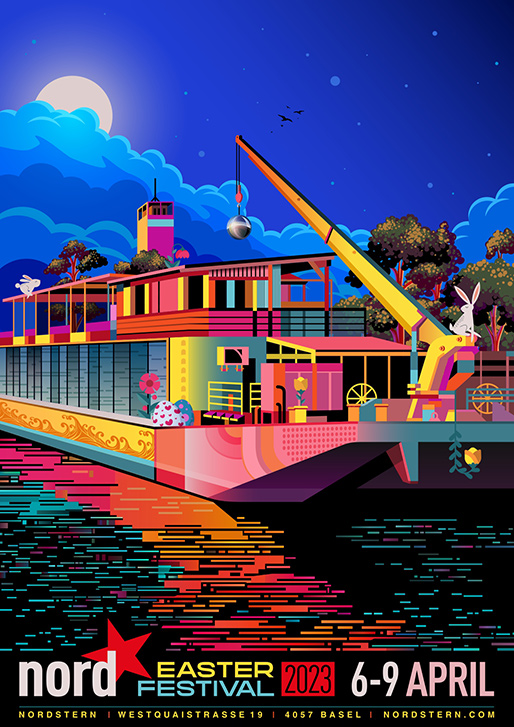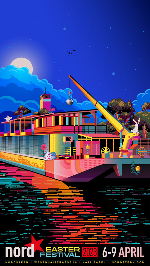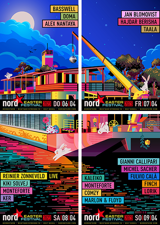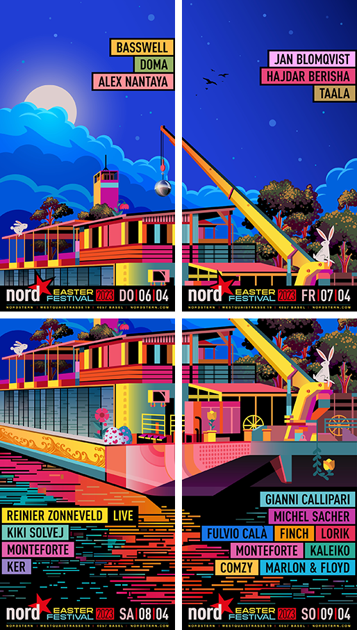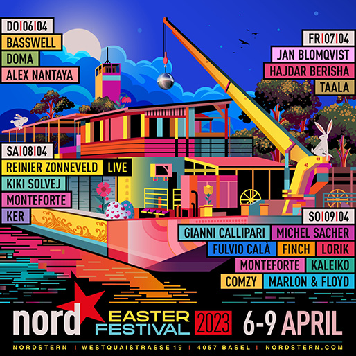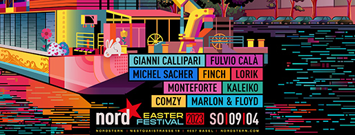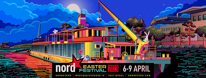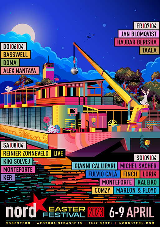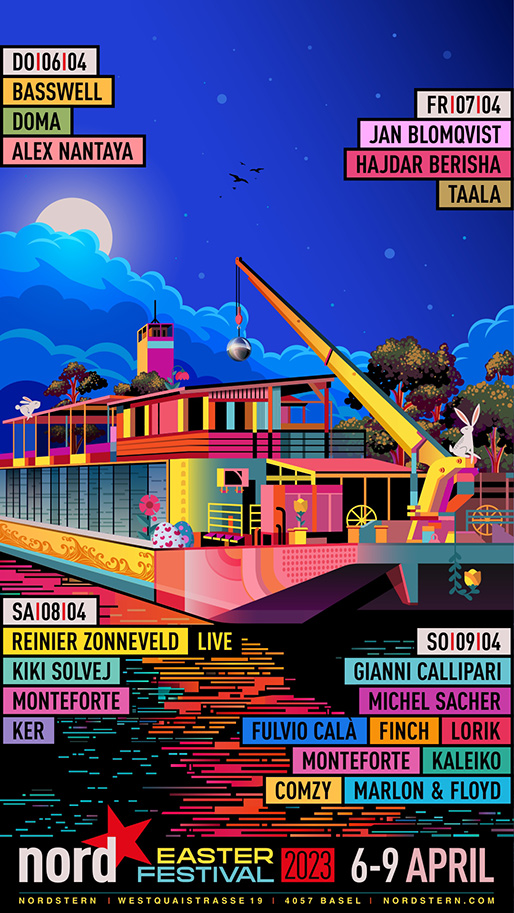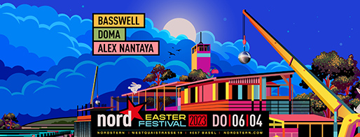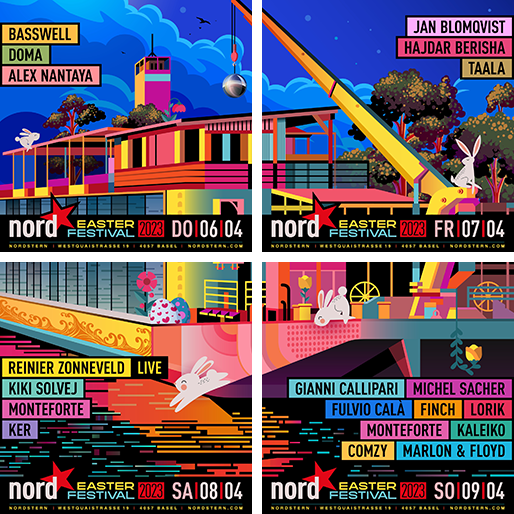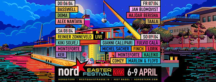 Description | Promotional artwork for an electronic music festival in Basel (Switzerland). NORDSTERN EASTER FESTIVAL 2023 6-9 April 2023 Basel, Switzerland Donnerstag, 6 April 2023 BASSWELL DOMA ALEX NANTAYA Freitag, 7 April 2023 JAN BLOMQVIST HAJDAR BERISHA TAALA Samstag, 8 April 2023 REINIER ZONNEVELD (LIVE) KIKI SOLVEJ MONTEFORTE KER Sonntag, 9 April 2023 GIANNI CALLIPARI MICHEL SACHER FULVIO CALĂ€ FINCH LORIK MONTEFORTE KALEIKO COMZY MARLON & FLOYD |